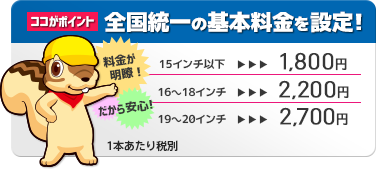 13~18インチ | 1本:¥1,100(税別) | 2本:¥2,200(税別) | 3本:¥3,300(税別) | 4本:¥4,400(税別) |